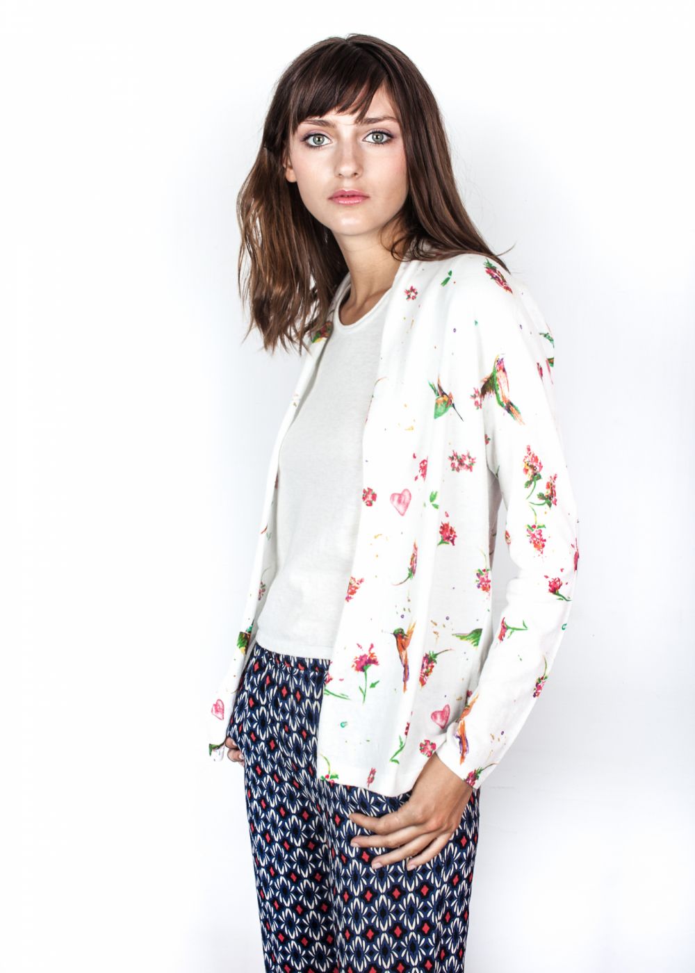 Gilet ouvert imprimé colibris - 90% Coton / 10% Cachemire