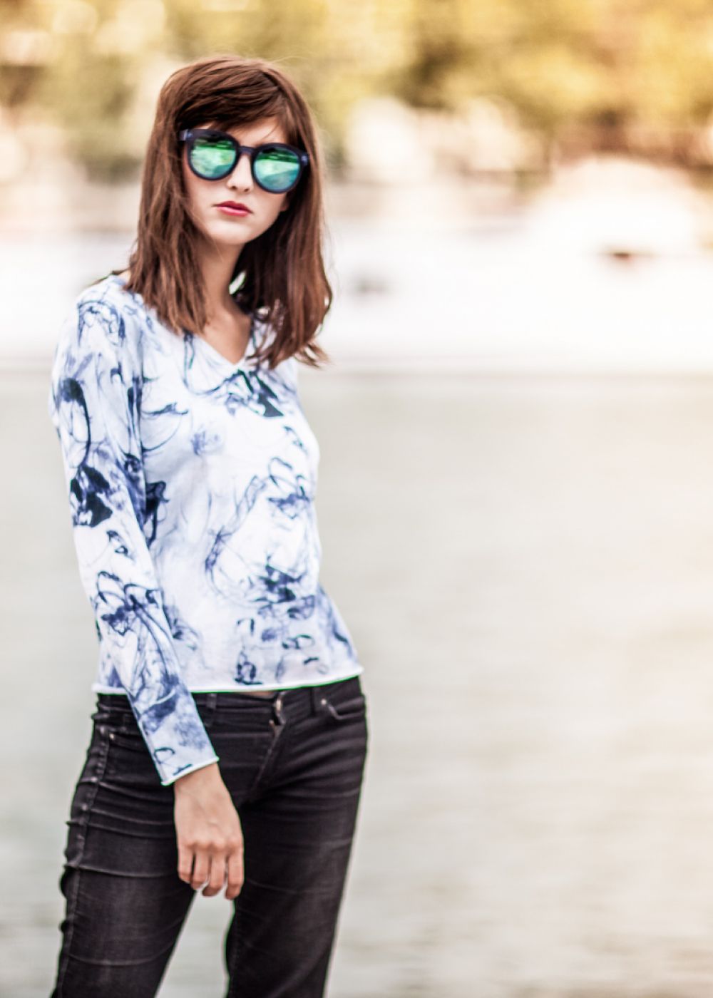 Pull col V imprimé fumée - 90% Coton / 10% Cachemire